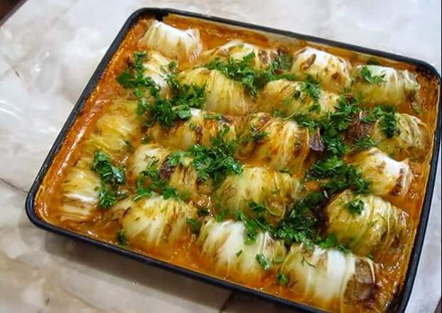 Перед подачей на стол голубцы из пекинской капусты посыпаем зеленью! Очень вкусно с домашней сметаной: и никакой поджарки! Все просто томится в духовке, в томатном соусе! Вот такой замечательный рецепт!